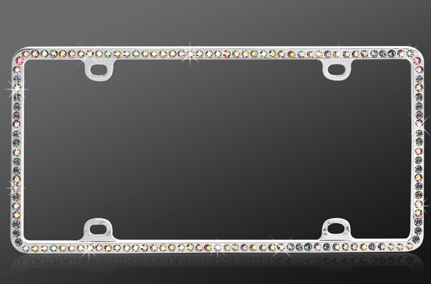 Add dazzling style to your ride with this multicolor crystal license plate frame. Designed with a sleek chrome-coated metal finish and single row of vibrant crystals, this eye-catching frame offers both durability and elegance. Made from stainless steel, it resists rust and corrosion while delivering a sparkling touch that shines in any light. A great gift for car enthusiasts or a glam accent for your own vehicle.
