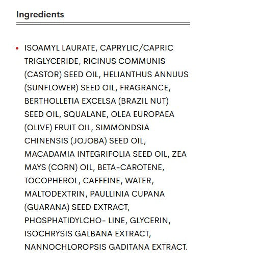 ISOAMYL LAURATE, CAPRYLIC/CAPRIC TRIGLYCERIDE, RICINUS COMMUNIS (CASTOR) SEED OIL, HELIANTHUS ANNUUS (SUNFLOWER) SEED OIL, FRAGRANCE, BERTHOLLETIA EXCELSA (BRAZIL NUT) SEED OIL, SQUALANE, OLEA EUROPAEA (OLIVE) FRUIT OIL, SIMMONDSIA CHINENSIS (JOJOBA) SEED OIL, MACADAMIA INTEGRIFOLIA SEED OIL, ZEA MAYS (CORN) OIL, BETA-CAROTENE, TOCOPHEROL, CAFFEINE, WATER, MALTODEXTRIN, PAULLINIA CUPANA (GUARANA) SEED EXTRACT, PHOSPHATIDYLCHOLINE, GLYCERIN, ISOCHRYSIS GALBANA EXTRACT, NANN OCHLOROPSIS GADITANA EXTRACT.